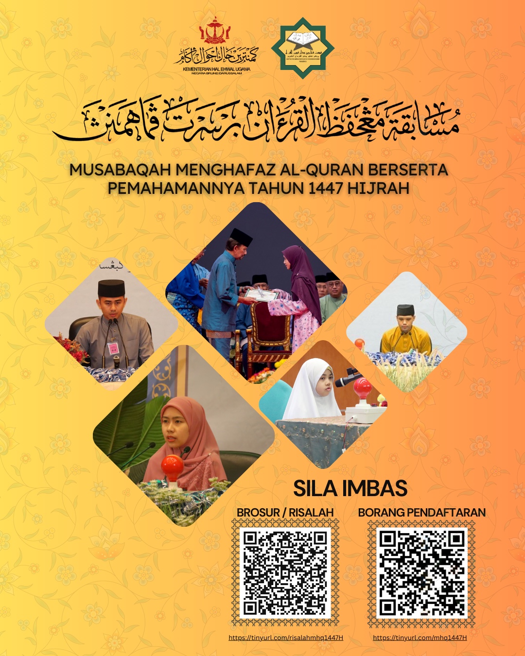 Kementerian Hal Ehwal Ugama melalui Pusat Pengajian dan Penyebaran Al-Quran MABIMS akan menganjurkan Musabaqah Menghafaz Al-Quran Berserta Pemahamannya Peringkat Kebangsaan Tahun 1447 Hijrah. Penyertaan Musabaqah ini dibukakan kepada rakyat Kebawah Duli Yang Maha Mulia Paduka Seri Baginda Sultan dan Yang Di-Pertuan Negara Brunei Darussalam atau penduduk tetap yang berugama Islam.