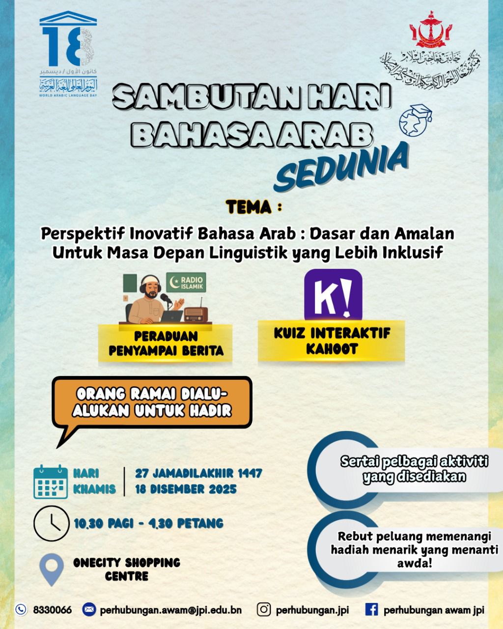 Unit Ta’zeez Al-Luhgah Al-‘Arabiah, Bahagian Sekolah Arab, Jabatan Pengajian Islam, Kementerian Hal Ehwal Ugama akan menganjurkan aktiviti berbahasa Arab sempena Sambutan Hari Bahasa Arab Sedunia 1447H/2025M yang akan diadakan pada hari Khamis, 27 Jamadilakhir 1447H bersamaan 18 Disember 2025M mulai 10.30 pagi hingga 4.30 petang bertempat di Pusat Beli Belah One City, Kampung Sungai Hanching.