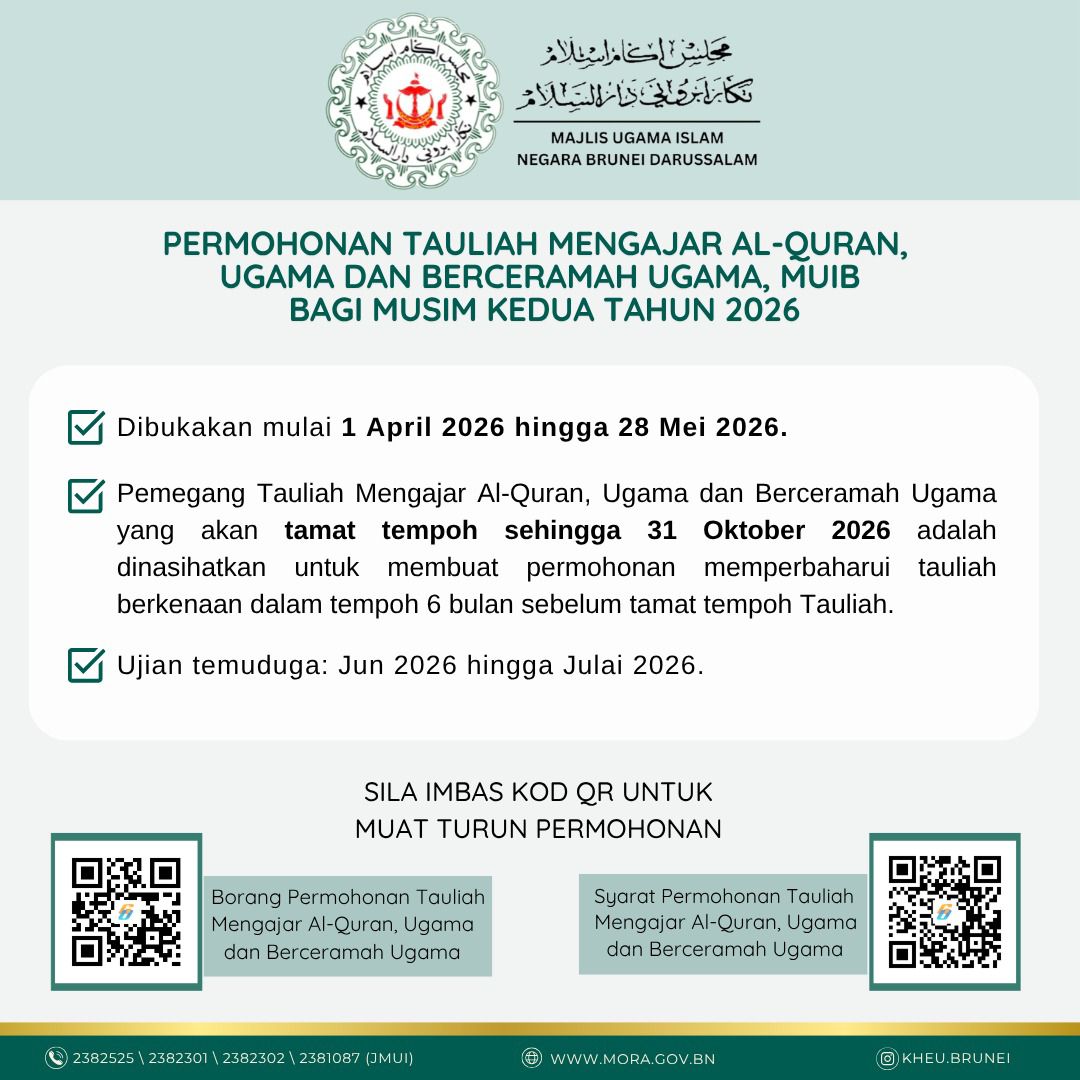 ​Permohonan Tauliah Mengajar Al-Quran, Ugama dan Berceramah Ugama bagi Musim Kedua Tahun 2026 adalah dibukakan mulai 1 April 2026 hingga 28 Mei 2026.
